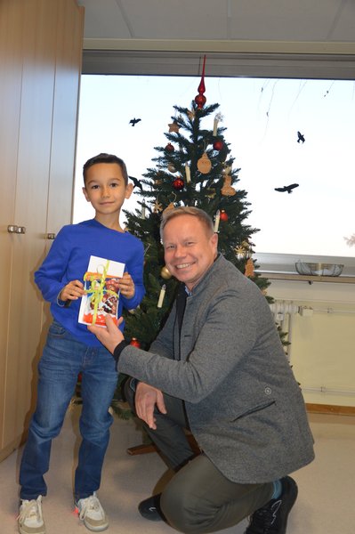 Heute war es dann so weit: die feierliche Übergabe. Mit einer großen Dose voller liebevoll gestalteter Lebkuchenanhänger machten sich Karim, Eliah und ihre Mama auf den Weg ins Verwaltungsgebäude. Vorstandssprecher Robert Koch empfing sie persönlich vor dem Christbaum und staunte nicht schlecht über die kreative und außergewöhnliche Ergänzung zum klassischen Baumschmuck. Gemeinsam mit Vorstandssprecher Robert Koch wurden die kleinen Kunstwerke an die Zweige gehängt.
